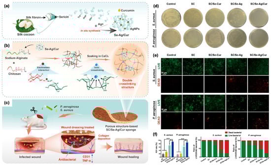 (a) Illustration of the sericin−AgNPs/curcumin (SC/Se−Ag/Cur) nanocomposite preparation process. (b) Illustration of the SC/Se−Ag/Cur sponge fabrication (c) and its use in enhancing infected wound healing. (d) Images of P. aeruginosa and S. aureus colonies treated with SC, SC/Se−Ag, SC/Se−Cur, and SC/Se−Ag/Cur sponges. (e) LIVE/DEAD bacterial staining. (f) Bacterial kill rates for P. aeruginosa and S. aureus treated with different sponges, with statistical significance (* p < 0.05, *** p < 0.001). Adapted with permission from [59].