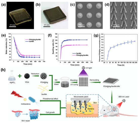 Overview of PDA@Ag/SerMA microneedles. (a,b) Optical images of SerMA and PDA@Ag/SerMA microneedles. (c,d) SEM images of SerMA microneedles. (e,f) Water retention and swelling ratio curves for SerMA microneedles before and after loading PDA@Ag NPs (n = 3). (g) Ag+ release curve from PDA@Ag/SerMA microneedles (n = 3). (h) Schematic of the preparation and application of the PDA@Ag/SerMA microneedle patch, which enhances wound healing through sustained Ag+ release and photothermal antimicrobial effects. Adapted with permission from Chen et al. Copyright (2024) American Chemical Society [48].