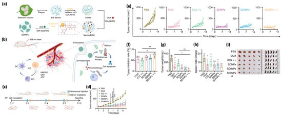 Overview of the pH-responsive sericin nanoplatform for combined photothermal therapy (PTT) and chemotherapy. (a) Diagram showing the preparation of the sericin-based nanoplatform, designed to carry the chemotherapeutic drug doxorubicin and the photosensitizer indocyanine green. (b) Illustration of the immunogenic cell death (ICD) triggered by the combined therapy. (c) Schematic of the treatment process and in vivo antitumor evaluation. (d,e) Tumor growth curves (average and individual) for all groups (n = 5). (f–h) Tumor inhibition rates, weights, and spleen indexes measured on day 12 (* p < 0.05, ** p < 0.01, **** p < 0.0001). (i) Optical images of tumors and spleens extracted post-treatment. Adapted with permission from [82].