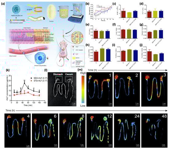 Pharmacokinetic characteristics and in vivo biosafety test of hydrogels. (a) Fabrication of the rhLF Sericin hydrogel for improving immunity of immunosuppressed mice. (b) Body weight growth of mice after oral administration of SSH-WT and SSH-rhLF (0.34). (c) Complete blood count of white blood cells (WBCs). (d) Level of glutamic-pyruvic transaminase (ALT) and (e) CK that are related to liver and kidney functions. Determination of main organ indices in mice including (f) the liver index, (g) spleen index, (h) lung index, (i) kidney index, and (j) cardiac index. (k) Pharmacokinetic profiles of rhLF in mice that were orally administered with STD-rhLF (0.17) solution or SSH-rhLF (0.17) hydrogels. (* p < 0.05; ** p < 0.01). (l) Bright-field images of the gastrointestinal tract (GIT) from the control group (without rhLF hydrogel treatment). (m) Biodistribution of rhLF hydrogels: the mice received oral administrations of rhLF hydrogels, and the fluorescence images of the GIT were obtained at various time points (1, 2, 3, 4, 6, 8, 12, 24, and 48 h). Adapted with permission from Xu et al. Copyright (2021) American Chemical Society [43].
