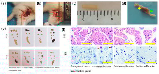(a) Surgical diagram of the autogenous nerve graft group; (b) surgical diagram of the stent group; (c) photo of the stent before implantation; (d) photo of the stent 4 weeks after implantation, with yellow and green arrows showing the proximal and distal ends, respectively. (e) Rat footprints from both groups at 2 and 4 weeks. (f) HE and TB staining of regenerated nerves 2 weeks post-surgery (scale: 50 μm), with blue arrows marking myelinated axons and red arrows marking neuronal cell bodies. Adapted with permission from [60].