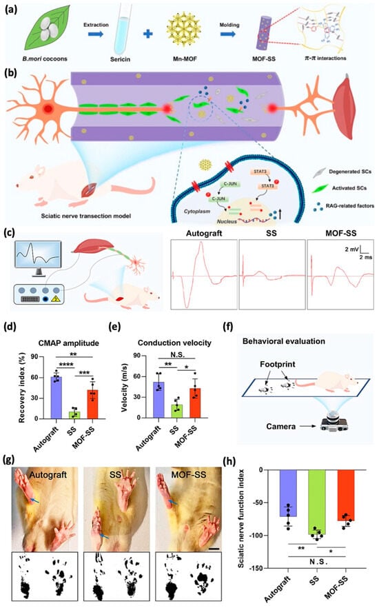 (a) Schematic illustration of MOF−SS fabrication and therapeutic mechanism for long-gap PNI nerve regeneration. Mn−MOF is incorporated as a bioactive additive to stimulate RAGs expression in SCs via STAT3 and C-JUN signaling pathways, conferring axon regeneration-promoting properties to MOF−SS. (b–h) Functional recovery facilitated by MOF-SS. (b) Schematics of electrophysiological tests. (c–e) Representative CMAP patterns (c), amplitude quantifications (d), and conduction velocity (e) for autograft, SS, and MOF−SS groups (* p < 0.05; ** p < 0.01; *** p < 0.001; **** p < 0.0001; ANOVA). Behavioral evaluation schematics (f), rat hind paw images and footprints with SFI quantifications (g,h), highlighting improved functional restoration with MOF-SS. Scale bar: 10 mm. Adapted with permission from [52].