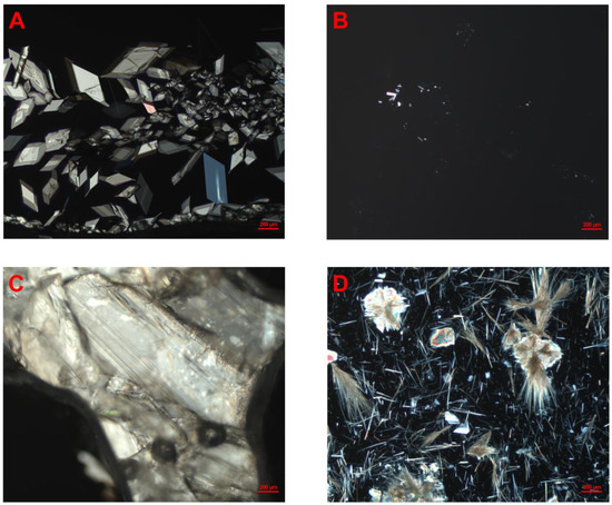 Pictures of celecoxib- and fenofibrate-loaded LBFs under polarized light, observed using optical microscopy. (A) Fenofibrate in MCT-based lipid-based formulation, 345% drug load, and 1 + 2-dilution with dichloromethane. (B) Celecoxib in MCT-based lipid-based formulation, 278% drug load, and 1 + 4-dilution with dichloromethane. (C) Fenofibrate in LCM-based lipid-based formulation, 557% drug load, and 1 + 2-dilution with dichloromethane. (D) Celecoxib in LCM-based lipid-based formulation, 475% drug load, and 1 + 4-dilution. All formulations were stored at ambient temperature.