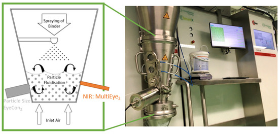 Fluidized bed granulation (FBG) is a well-known wet granulation (particle size enlargement) methodology in the pharmaceutical industry for preparing intermediate or active pharmaceutical products. In the FBG process, dry mixing, wetting, and drying are accomplished in a single operation unit, which simplifies the granulation process [1]. Compared to dry granulation, wet granulation offers better control of drug content uniformity, product bulk density, and compatibility [2]. Understanding the fundamental physical and chemical attributes that contribute to the granule properties and granule behavior will impact the final product. How a material granulates depends on formulation properties, equipment type, and operating conditions. Control of the fluidized bed process is essential to ensure the consistent production of granules with the desired quality characteristics (i.e., granule size, size distribution, moisture content, flowability, etc.) [1]. Batch non-conformance detection [3], accurate moisture [3,4], and granule particle size determination [5] are crucial aspects of FBG control, especially on or before the endpoint phase of the process [6]. It is therefore vital to monitor granule particle sizes to ensure the final quality of the product [5], while the quality includes uniformity in tablet weight and consistency in hardness [7].