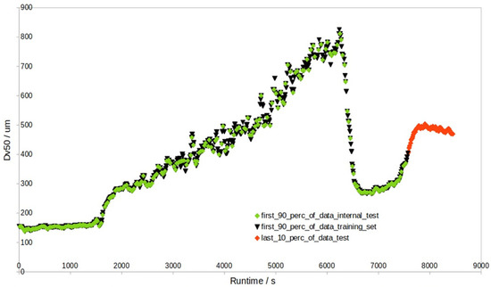 Regarding the literature on cross-validation errors in the prediction of Dv50 particle sizes, as differences from target values, they vary from 70.4 μm [10] to 96 μm [5], with a target value range of 48–1052 μm in Ref. [10] and 98–1017 μm in Ref. [5]. These errors are comparable to the reported laboratory reference Camsizer standard error of ±59 μm for Dv50 [5]. However, these literature RMSE values were obtained by internal validation, and the models comprise every batch (at least in part); so, they are not necessarily an estimate of a prediction error forecast of granule sizes for a new independent batch. Also, the endpoint of the granulation process is based on these RMSE values, and it does not regard the prediction of the last segment of the FBG batch experiment (e.g., the last 5% of the batch running-time data). The last drying segment most closely represents the product particle size outcome. Significantly improving the prediction accuracy of the granule particle size in this stage of the process could lead to an enhancement of fluidized bed process control. This advancement would consider inline batch granule size determination and the prediction of the whole test batch without Eyecon sizes, using previously obtained training batches with Eyecon sizes. This is the primary task of this study. The secondary task might be to identify the outlier batches and to compare them with non-outliers in the context of both the offline (i.e., already obtained all-batch data) and inline (i.e., real-time in-process) data of FBG experiments.