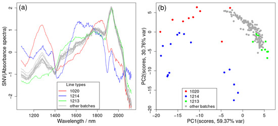 (a) Average SNV of the NIR spectra for each of the 14 batches, and (b) first two principal components (accounting for 90% of the total variance) of the SNV of the NIR spectra for all LOD-NIR data batches. The 3D plot can be found in Supplementary Figure S1a in the Supplementary Materials.