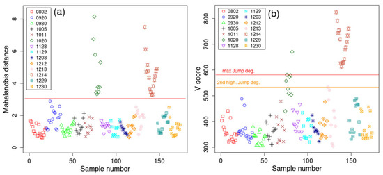 (a) Mahalanobis distance using the first five PCs of the SNVs of the NIR spectra for each of the 14 batches, and (b) V score based on Ref. [18] calculated using the SNVs of the NIR spectra. Here, the maximum jump threshold and the second highest threshold (close to the maximum threshold) were considered.