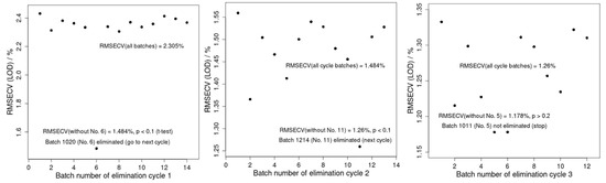 To further prove the outlier batches, the BBE-PLS procedure for predicting LOD values was carried out as described in Section 2. The results of the BBE-PLS are presented in Figure 5. It reveals that, based on lower and significant p-values, both ‘1020’ (p < 0.1) and ‘1214’ (p < 0.1) are outlier batches, while other batches are not (p > 0.2).