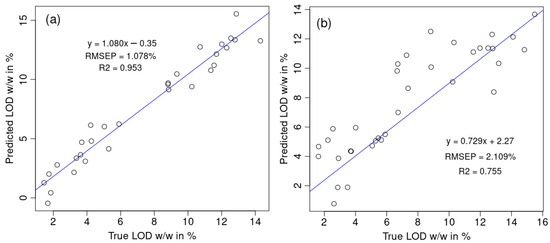 Comparison between the model’s accuracy on the test set (30 NIR spectra containing LOD values) between (a) the dataset without outliers and (b) the dataset containing outlier batches.