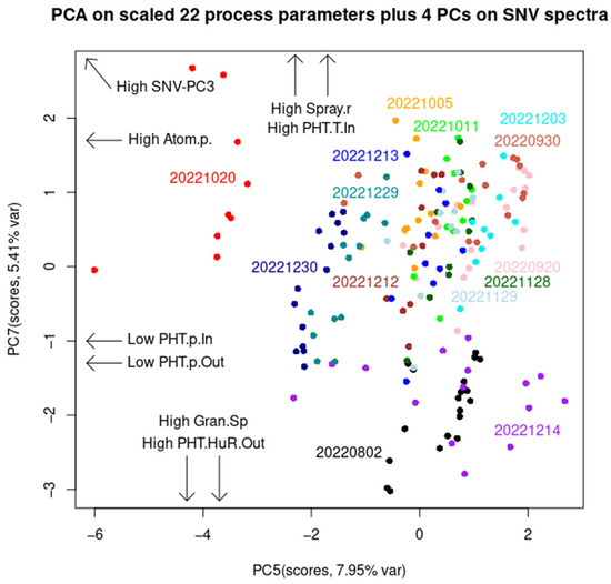 Figure 7 displays a score plot with arrows denoting the direction of certain process parameters. Here, PC5 and PC7, although with only a 13.1% total variance, contribute to discriminating between the batches ‘1020’ and ‘1214’. This is not too unusual, as these two batches contain 24 out of the total 174 LOD measurements, and 24 divided by 174 equals 13.7%. These two batches differ from other batches in many different process parameters and in the opposite way. Concretely (Figures S3–S7, Tables S1–S4), batch ‘1020’ has the highest average values for the following process parameters among other batches: LOD, airflow rate, atomization pressure, exhaust air temperature, inlet air temperature, plenum air temperature, product temperature, spray rate, and PHT pressure inlet. All ‘1020’ batch samples have a higher atomization pressure than the rest of the samples in all the other batches. The ‘1020’ batch samples also have the lowest PHT pressure inlet and outlet and the lowest endpoint Dv50 granule size of only 75 μm. On the other hand, batch ‘1214’ has the highest endpoint Dv50 granule size of 511.7 μm, in conjunction with other process parameters of opposite extremes to those in batch ‘1020’ (Figure 7). For batch ‘1020’, there is no significant correlation between the SNV-PC1, SNV-PC2, and SNV-PC3 scores and any process parameter. In contrast, batch ‘1214’ has a very high positive correlation between SNV-PC1 and the PHT humidity inlet (r = +0.93) and outlet (r = +0.96). SNV-PC1 represents water content, while high SNV-PC3 is followed by a high atomization pressure and spray rate, and a low PHT pressure inlet and outlet. Nevertheless, it is interesting to note that if SPP-PCA is carried out alone (i.e., without the NIR spectra), this analysis would barely classify batch ‘1020’ (Figure S6) and would not discriminate ‘1214’ from other batches (Figure S8). However, the PCA on 12 non-outlier batches was able to classify them into four groups: I. batch 0802, II. batch 0930, III. batches 1212, 1213, 1229, and 1230, and IV. the other six batches (Figures S9 and S10). This is because batch 0802 has the highest average PHT absolute humidity inlet and outlet, and PHT relative humidity inlet, while batch 0930 has the lowest average product temperature and spray rate and the highest average PHT relative humidity outlet. The simple analysis based on airflow rate, inlet air temperature, atomization pressure, and pump speed could not discriminate outliers from non-outlier batches (see Figure S11). More batch classification information is in the Supplementary Materials.