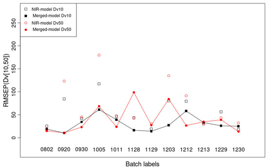 Significant difference in granule sizes (Dv10 and Dv50) between the NIR model (unfilled squares and circles) and the merged model (NIR + pars) (filled ones connected with lines) from the external test RMSEP for MA 1 (see Table S6 for full information).