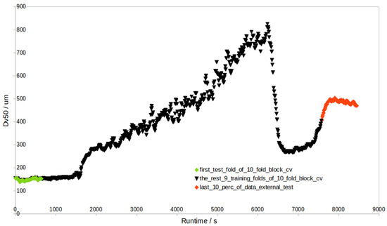 When the external test results in Table 2 and Table S6 are compared with those of the internal test (Table S7, Figure 2), the difference is prominent. The validation of 1/10 of the internal test data revealed much lower RMSEP values (Table S7), and the internal RMSEP highly agrees with the RMSECV of the training data (e.g., for NIR + pars-PLS with outliers, RMSECV (Dv50) = 19.7 μm, RMSEP (Dv50, internal test) = 19.3 μm). At the same time, there are no signs of overfitting, as the RMSECV/RMSEC ratio is 1.0 (Tables S8 and S9). This means that RMSEP for the internal test set cannot be simply used as an estimate of error for the endpoint granule size prediction (i.e., the last 10% data), as obviously, such an internal test set is too different from an external test set. This must be emphasized, as the internal and external test sets defined in Figure 2 have different levels of prediction difficulty. The literature on granule size prediction has not yet made any such clear distinction. This issue can be resolved by replacing the sequential-CV approach (Figure 2) with a block-CV approach (Figure 9, Table S10), as the obtained RMSECV (average Dv50 = 34.7 μm) with block-CV can roughly estimate the average RMSEP of the external test set (average Dv50 = 38.8 μm). However, the block-CV approach yields RMSECV vs. the number of component plots where either too few or too many PLS components are selected, which leads to PLS models of even worse external RMSEP (average Dv50 = 44.1 μm). This is why sequential-CV, yielding RMSECV plots with a more accurate selection of the number of components, was used most of the time in this study.