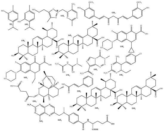| 19 | −5.54 | 1.48 × 10−3; 2.86 × 10−6 | Moderately soluble | −6.38 | 2.14 × 10−4; 4.15 × 10−7 | Poorly soluble | −6.63 | 1.20 × 10−4; 2.32 × 10−7 | Poorly soluble |