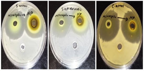 The agar well diffusion method revealed no significant difference in activity between the minocycline and the NC formulation on C. acnes (p-value: 0.578), S. epidermis (p-value: 0.071), and S. aureus (p-value: 0.179) according to an unpaired t-test, as presented in Table 1 and illustrated in Figure 3.