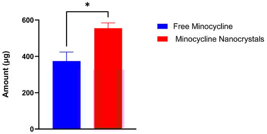 Minocycline amount (µg) deposited in rat skin after 24 h of the application of free minocycline solution and minocycline nanocrystals in a Franz diffusion study. (mean ± SD, n = 3). *: significantly different than each other (p-value = 0.0103).