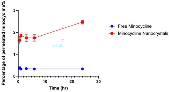 The targeted delivery of minocycline into the skin includes depositing the drug locally while ensuring minimum drug permeation into the systemic circulation [36]. This experiment was performed to evaluate the potential of an NC formulation to provide the targeted delivery of minocycline. NCs and free minocycline solutions were each placed on the top of the outer surface of the skin and maintained for 24 h in the Franz cells setup. After completing the experiments, skin pieces from both groups were processed and analyzed to quantify minocycline using a UV spectrophotometer. NCs were able to deposit 554.56 ± 24.13 μg whereas free minocycline deposited 373.99 ± 23.32 μg. The difference between the two values was significant (p-value = 0.0103), as shown in Figure 4, indicating the higher ability of NCs to deliver minocycline locally. In terms of drug permeability, minocycline permeation through skin layers into the reservoir compartment was evaluated from the free drug solution and nanocrystal solution using a UV spectrophotometer as shown in Figure 5. Minocycline permeability through rat skin layers after 24 h of application, calculated as a percentage of the total minocycline placed on top of the skin, was 0.33 ± 0.001% for free drug and 2.46 ± 0.076% for NCs. Both solutions showed a minimum drug permeability which can be justified due to the hydrophilic nature of minocycline. This topical application of minocycline deposited, as a percentage of the total applied drug, was about 11.09 ± 0.48% for NCs and 7.47 ± 0.81% for free minocycline with minimum drug permeation. NCs showed a superior drug deposition compared with free minocycline and minocycline foam, as was previously reported [37]. This might be due to the small size of the NCs, which facilitated the drug’s penetration and distribution through skin layers.