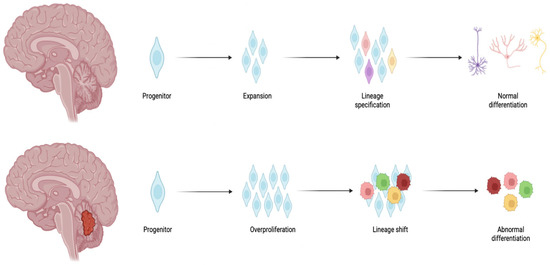 One of the most prevalent pediatric brain tumors in the posterior cranial fossa is medulloblastoma (MB), accounting for 20% of all pediatric brain tumors (WHO grade IV) [1]. The majority of MB cases occur in children between 3 and 7 years. Although the 5-year overall survival rate for MB is around 75%, there are still major concerns about long-term therapy-related complications [2]. In modern classification, MB is recognized as a heterogeneous tumor with multiple subtypes, all sharing a common primitive embryonal phenotype, consisting of malignant cells primarily characterized by neuronal antigen expression. From a biological point of view, the development and heterogeneity of MB involve the overproliferation of progenitor neural cells of the rhombic lip and a lineage shift towards cells with a malignant phenotype (Figure 1).