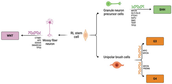 Schematic representation of MB subgroups classification. Arrows show molecular MB groups originated from RL stem cell (RL = Rhombic lip; WNT = Wingless; SHH = Sonic Hedgehog; G3 = Group 3; G4 = Group 4). Created with BioRender.com.