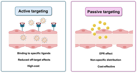 In order to achieve effective drug delivery, it is important to understand the pathophysiological features of the tumor environment. In solid tumors, the new blood vessels are different from those of normal tissues, which are dense. Hence, there are gaps between endothelial cells. The enhanced permeability and retention (EPR) effect is a consequence of the different vascularization, which causes the accumulation of molecules of certain sizes in tumor tissue [47,48]. Therefore, passive targeting exploits the EPR effect to facilitate the delivery, accumulation, and retention of molecules/nanoparticles in the tumor site [49]. This phenomenon is influenced by NPs size, shape, and surface properties, which need to be finely tuned to obtain the best performance [50]. Although this strategy appears promising, actual clinical application has not yet been consistently achieved [51].