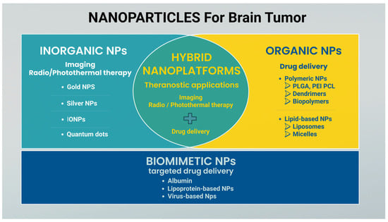 Nanoparticles (NPs) can be systematically classified according to their chemical composition. The specific physicochemical properties translate into distinct advantages for biomedical applications. According to the literature, organic NPs are mainly used for drug delivery, while inorganic NPs are used for imaging and for radio/photothermal therapy. The encapsulation of inorganic NPs into organic nano-compartments or mixed lipid-polymer carriers results in hybrid systems with enhanced potential applications in drug delivery, bioimaging, and theranostics [60]. Biomimetic NPs are mainly applied to targeted drug delivery, enabling reduced drug dose to achieve therapeutic effects. Figure 4 summarizes the main types of NPs studied for their application in the context of brain tumors.