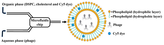 However, liposomes prepared by traditional methods, such as electroformation, thin-film hydration, sonication, solvent dispersion, reverse-phase evaporation, and thin-film extrusion, have the disadvantages of small particle size and inhomogeneity and are unable to encapsulate large-size (>300 nm) phages [19]. The newly developed microfluidic controlled preparation method has the advantages of small reagent consumption and a controllable average size of liposomes. By optimizing the material ratio and production parameters, stable and uniform large unilamellar vesicles (0.1–1 μm) can be prepared to achieve the encapsulation of large-size phages [18,20].