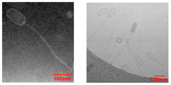 The sampled hospital sewage was centrifuged with the cryogenic centrifuge (Sartorius G-26C, 37070 Goettingen, Germany) at 6656× g for 10 min, and the supernatant was filtered through a 0.22 μm filter to obtain the crude phage treatment solution. A total of 1 mL logarithmic-phase host bacteria and 1 mL phage crude treatment solution were incubated in 10 mL LB medium at 37 °C for 8 h. The phage stock solution was obtained using the cryogenic centrifuge (Sartorius G-26C, 37070 Goettingen, Germany) at 6656× g for 10 min, followed by filtration of the supernatant; this was repeated three times. In the double agar overlay drop plaque assay, 100 μL logarithmic phase host bacteria and 5 mL melted semi-solid medium were mixed and poured into the bottom agar plate. After coagulation, 3 drops of 5 μL phage stock solution were added and incubated at 37 °C overnight, and the next day, the transparent or cloudy lysis area was observed. The phage was concentrated and purified by PEG precipitation with reference to the method in the literature [27].