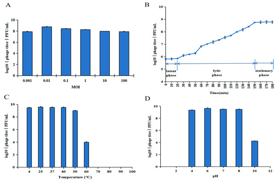 A total of 100 μL of each phage (3 × 109 PFU/mL) was added to 900 μL of SM buffer at pH 2.0, 4.0, 6.0, 7.0, 8.0, 10.0, and 12.0. After incubation for 1 h at 37 °C, the phage titer was determined by the double agar overlay plaque assay. Three parallel experiments were performed for each group.