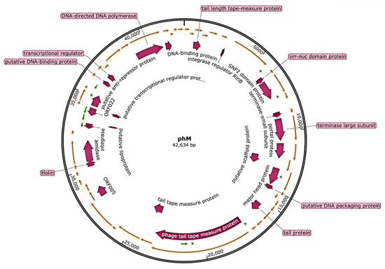 The genome map of vB_SauS_PHM is shown in Figure 4. It was 42,634 bp in length (33.79% G/C) and contained 59 Open Reading Frame (ORF) groups, of which 23 ORFs were predicted to encode functional proteins (Table S2) with no putative tRNA genes. The genome of vB_SauS_PHM did not contain known virulence factors or antibiotic resistance genes as checked by VFDB and CARD. Phylogenetic relationships between vB_SauS_PHM and other staphylococcal phages are shown in Figure S3; the most closely related are bacteriophages SAP11 (MK801681.1) and SMSAP5 (NC_019513.1, JQ779023.1). According to ICTV guidelines and morphological characteristics [29], vB_SauS_PHM belonged to Duplodnaviria, Caudovirales, Siphoviridae, and Triavirus.