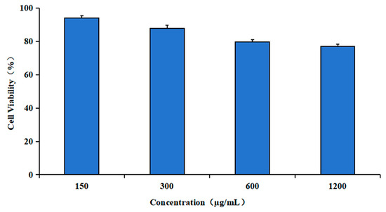 The biotoxicity of a drug carrier represents a significant factor influencing its potential applications. To investigate the toxicity of varying concentrations of TAT-Lip@PHM on RAW 264.7 cell, we employed the MTT assay. The results, as illustrated in Figure 6, demonstrated that following the co-incubation of RAW 264.7 cells with TAT-Lip@PHM at final concentrations of 150, 300, 600, and 1200 µg/mL for 24 h, the cellular activities were 94.19%, 87.98%, 79.84%, and 77.13%, respectively. These findings indicated that TAT-Lip@PHM at 300 µg/mL and below exhibited good cytocompatibility, with >85% cell viability.