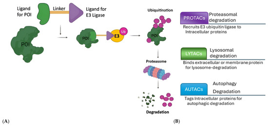 (A) Action mechanism of the PROTACs (POI: protein of interest, E3: E3 ubiquitin ligase; Ub: ubiquitin). (B) Comparison of PROTACs (Proteolysis-Targeting Chimeras) with LYTACs (lysosome-targeting chimeras) and AUTACs (autophagy-targeting chimeras).
