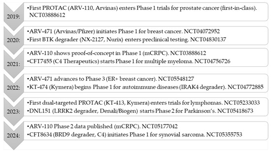 PROTACs clinical milestones (2019–2024).