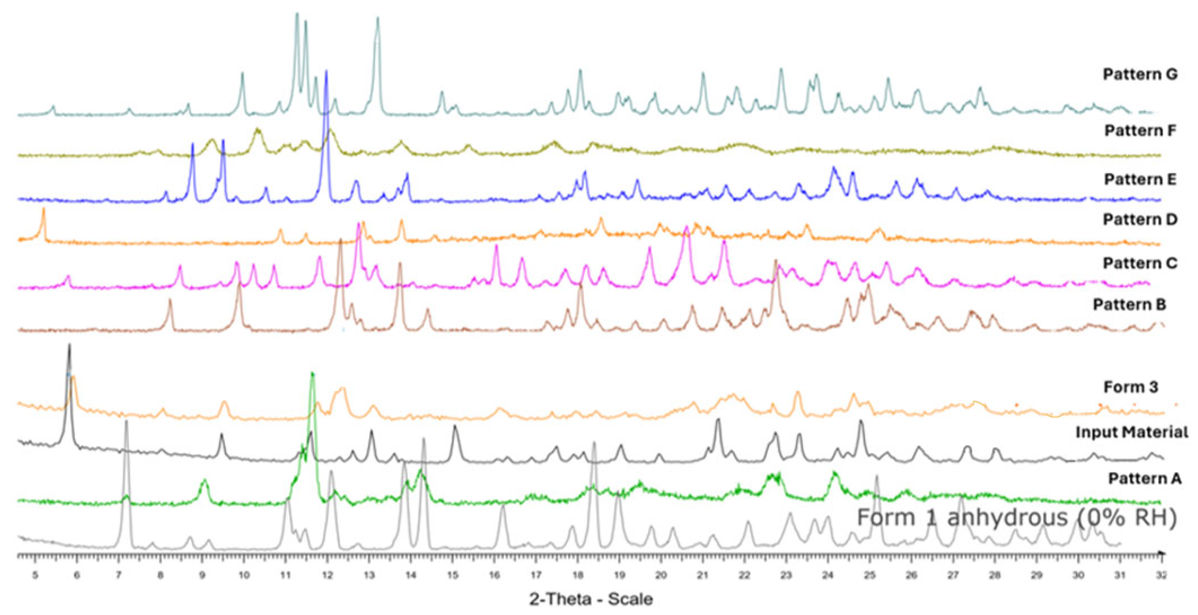 | XRPD post storage at 40 °C/75% RH 1 week. | Not performed | Form 1 | Pattern A | Pattern E | Pattern E | Form 1 | Form 3 |