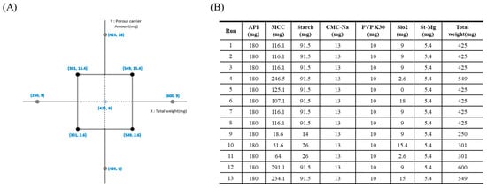 A DoE approach was implemented using Minitab® ver21.4.2 (Minitab Inc., State College, PA, USA) to systematically analyze the relationships between experimental variables and responses. A central composite design (CCD) was employed to facilitate the development of an optimal formulation, as illustrated in Figure 1A. The CCD incorporates factorial, axial, and central points to ensure comprehensive exploration of the experimental space. Factorial points were employed to explore extreme values within the design space, whereas axial points extended beyond these limits to assess the potential nonlinearity in the responses. Center points were included to evaluate experimental variability and estimate potential errors. In this study, tablet weight (five levels) and amount of porous excipient (five levels) were selected as the key independent variables. For the experimental formulation study with a total weight ranging from 425 to 600 mg, the amount of MCC was adjusted. For those with a total weight of 250 to 300 mg, both MCC and pregelatinized starch contents were modified. The ratio of MCC to pregelatinized starch was determined based on prior formulation experience to achieve appropriate compressibility and tablet weight. These factors were selected to examine their influence on the dissolution rate and residual solvents, which are considered critical quality attributes (CQAs) of the final product. Thirteen experiments were conducted based on the CCD matrix to ensure adequate statistical power for the optimization. The experimental formulation and design matrix are shown in Figure 1B. FEX, MCC, PCS, CMC-Na, and SiO2 were placed in a P 1–6 high-speed mixer (Diosna, Osnabrück, Germany) and mixed at 250 rpm for the agitator and 2200 rpm for the chopper for 3 min while adding granulating liquid as 100% EtOH. After mixing, the granules were dried at 50 °C for 2 h, passed through a 1 mm sieve, and then mixed with Mg.st. The final granules were compressed at 10 kPa using an Autotab-200TR (Ichihashi Seiki, Kyoto, Japan).