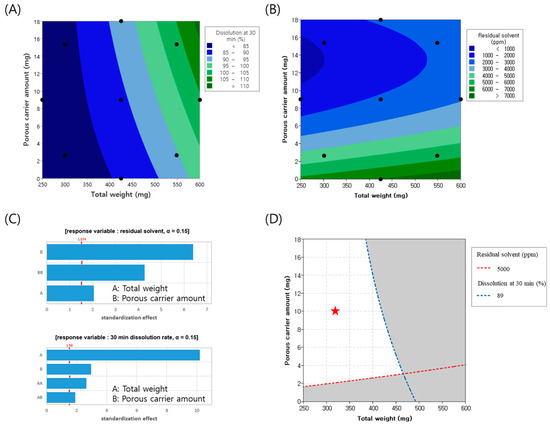 The results of modeling the design of experiments: (A) dissolution rate contour plot for colloidal silicon dioxide and total weight, (B) residual solvent contour plot for colloidal silicon dioxide and total weight, (C) Pareto chart, and (D) optimization plot showing the effect of colloidal silicon dioxide and total weight. The red star represents the optimal point.