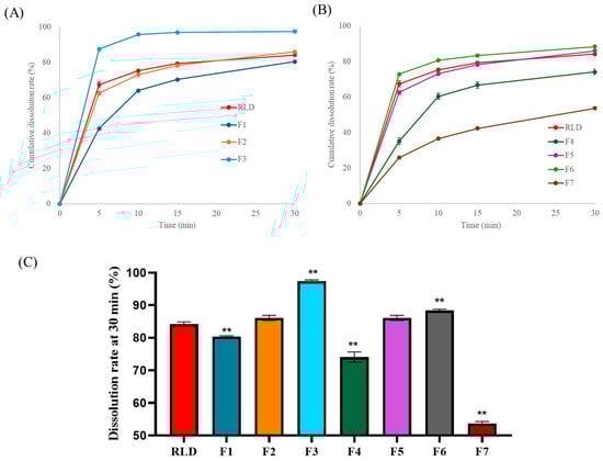 Dissolution results of RLD and F1–F7; (A) dissolution profiles of F1–F3 prepared using ethanol solutions of varying concentrations, (B) dissolution profiles of F4–F7 using different types and amounts of porous agents, and (C) dissolution rate at 30 min of prepared formulations (n = 4). All values are presented as mean ± standard deviation (SD). All values were statistically analyzed by one-way ANOVA with post hoc Dunnett’s test. ** p < 0.01; compared with RLD.