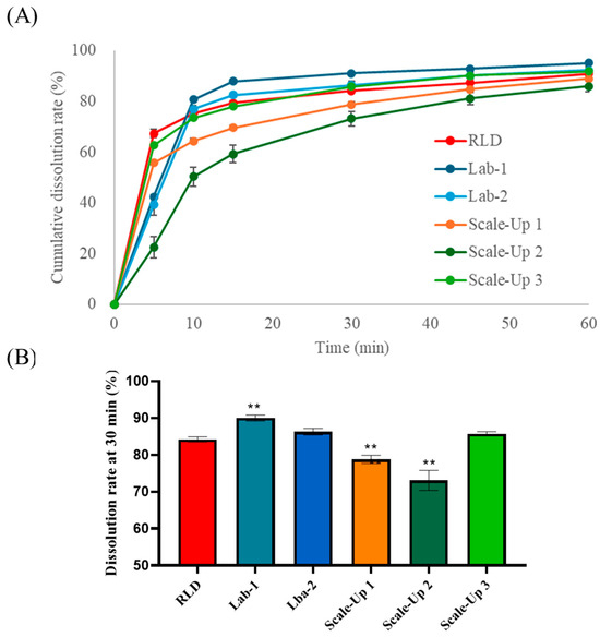 Dissolution results RLD, Lab-1 and -2, and Scale-Ups 1–3; (A) dissolution profiles of Lab-1 and -2 and Scale-Ups 1–3, and (B) dissolution rate at 30 min. All values are presented as mean ± standard deviation (SD). All values were statistically analyzed by one-way ANOVA with post hoc Dunnett’s test. ** p < 0.01; compared with RLD.
