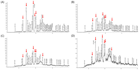 PXRD stability test results: (A) fexofenadine HCl; (B) physical mixture; (C) initial; (D) 6 months accelerated. The red arrows indicate the characteristic peaks of fexofenadine HCl form I (2-theta: 12.3°, 14.3°, 18.5°, 19.6°, 20.1°, and 24.1°).