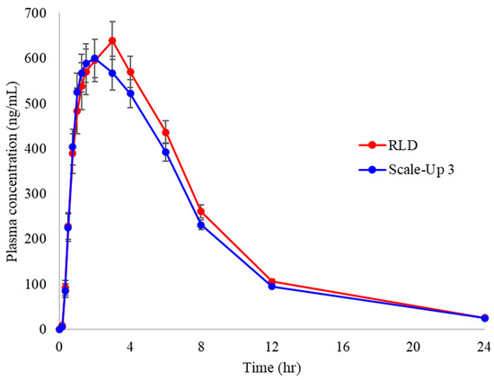 This study evaluated whether the manufacturing process parameters established at the laboratory scale could maintain the performance characteristics of the formulation, particularly the dissolution rate and physical properties, during scale-up to commercial production. Initially, Lab-1 and Lab-2 batches were manufactured using the optimized laboratory-scale process with different blending times to compare the granule properties and dissolution rates. Despite a two-fold difference in blending time, no significant differences were observed in the granule properties, tablet properties, or dissolution rates between the two batches. However, the direct application of optimized laboratory conditions to a scaled-up process presented challenges. Among the various parameters, agitator speed has been identified as a critical factor influencing granule properties. Therefore, at the initial stage of the scale-up, the agitator speed was set to 100 rpm based on the Froude number derived from laboratory conditions, and the blending time was adjusted to 2 min. Various process conditions were tested to assess their impact on the granule and tablet properties. The process conditions are listed in Table 5. The bulk density (BD) of the granules varied depending on the blending conditions, showing notable differences among the scaled-up batches 1, 2, and 3. The BD of scale-up batch 3 closely resembled that of the laboratory batch. Analysis of the 30 min dissolution rate in pH 4.0 buffer demonstrated that the dissolution profile of scale-up batch 3 was highly comparable to that of both the commercial and laboratory batches. As shown in Figure 4, these results suggest that scale-up batch 3 successfully transitioned from laboratory to commercial scale. As shown in Figure 5A, the final formulation achieved a 44% reduction in weight and an approximately 50% reduction in volume compared with the marketed product, potentially improving patient compliance. A dissolution comparison between the marketed product (Allegra) and scale-up batch 3 was confirmed, as illustrated in Figure 5B–D. Dissolution testing in three different media confirmed that the dissolution profiles at pH 4.0 and pH 6.8 were nearly identical to those of the reference product. However, at pH 1.2, the initial dissolution rate was higher than that of the commercial product. This accelerated drug release at pH 1.2 is likely attributable to the enhanced solubility of FEX through porous formulation technology, despite its inherently low solubility under acidic conditions. Since the primary absorption sites for FEX are the duodenum and small intestine [28,29], the difference observed at pH 1.2 was not expected to have a significant impact on bioequivalence. An in vivo bioequivalence study in humans was conducted to evaluate the pharmacokinetic similarities between the formulations.