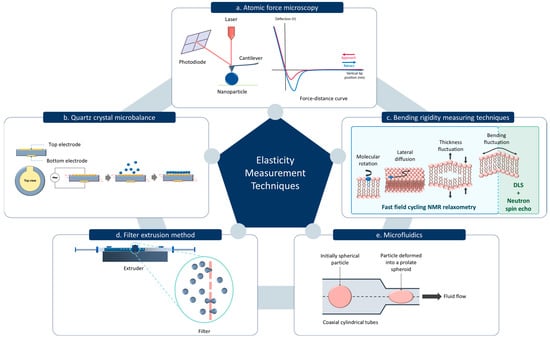 Common techniques for measuring material elasticity. (a) Atomic Force Microscopy. (b) Quartz Crystal Microbalance. (c) Bending rigidity measuring techniques including the fast field cycling Nuclear Magnetic Resonance (NMR) relaxometry and the Neutron spin echo and Dynamic Light Scattering (DLS) measurement. (d) Filter extrusion method. (e) Microfluidics method.