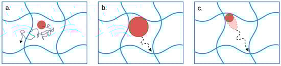 Hopping behavior is one of the diffusion mechanisms observed in nanoparticles, in which the particles hop between neighboring polymer entanglements [,]. Yu et al. (2022) [] explained that increased mesh size reduces the adhesive interactions between the particles and other attraction points of the mesh, resulting in a tight attachment of particles to one region []. When the affinity of the hydrogel increases, Tian et al. (2019) [] also explained a similar tight attachment of particles to the hydrogel []. Therefore, regardless of the particle stiffness, a small mesh size promotes the hopping diffusion of the particle. With optimal mesh size, diffusivity is affected by the stiffness of the particle and adhesion strength. Semi-elastic particles experience attractions from different adhesive regions while deforming themselves and possessing a high diffusion rate []. A simulation study conducted on a series of liposomes with different elasticities demonstrates a similar concept, where semi-soft liposomes exhibit an attraction toward one corner of the network and then deform into an ellipsoidal shape due to the attraction to another corner. Due to these attraction forces and deformation energy, liposomes diffuse from one corner to the other. Further, this study has explored the effect of liposome phase transition temperature (Tm) on particle penetration. Simulated data revealed that at low temperatures, particle diffusivity is a minimum, and upon temperature increment, the semi-soft particles showed a diffusivity of ~1.8- and 2.7-fold higher than the hard and the soft liposomes, respectively. Further increase in temperatures led the hard particles to diffuse ~1.7- and 3.3-fold higher than semi-soft and soft liposomes, respectively. This depicts the effect of temperature on elasticity, which ultimately affects the penetration efficacy []. Concluding these results, Yu et al. (2022) [] suggested that soft particles are better applicable in penetrating hydrogels with large mesh size and weak affinity strengths (Figure 3a), while rigid particles are more prone to diffuse in smaller mesh-sized, stronger affinity hydrogels (Figure 3b). Semi-elastic particles are more suited to diffuse in large mesh-sized, strong affinity hydrogels (Figure 3c) [].