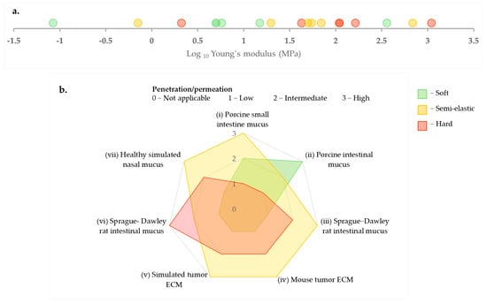 A recurring trend, observed across different types of hydrogels such as mucus (nasal, intestinal) and ECM, is the enhanced penetration of intermediate or semi-elastic nanoparticles [,,,]. Furthermore, computational models supported this idea, indicating that semi-elastic particles can optimally balance deformation energy and adhesive interactions within the polymer network under specific conditions of mesh size and affinity [,]. However, drawing a universal conclusion is more complex. Firstly, classification of particles as soft, semi-elastic, and hard is study-specific and depends on the relative comparisons of particles within the study. For instance, Yu et al. (2022) [] define particles with a Young’s modulus of 2 MPa as hard, whereas Yu et al. (2018) [] consider 5 MPa as soft, which is more than twice the value used in the former study to define completely different classes of particles [,]. Figure 4a presents elasticity values from six different studies, all measured using AFM, along with their respective classifications. The figure clearly illustrates the wide range of these Young’s modulus values, spanning from kPa to GPa, and how each study categorizes them in relation to the particles they investigated. Next, Figure 4b depicts their penetration behaviors across various hydrogel types. This highlights that drawing conclusions focusing solely on stiffness classification can be misleading when the absolute Young’s modulus values are not considered.