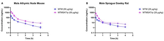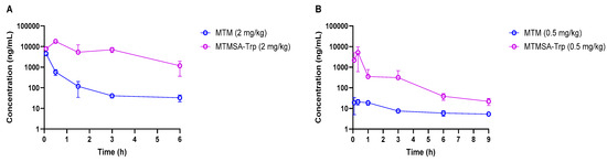 Comparison of MTM and MTMSA-Trp concentration–time profiles in (A) mouse and (B) rat at doses allometrically equivalent to 12 µg/kg in monkey.
