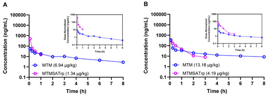 Noncompartmental analysis (NCA) was performed using PKanalix version 2024R1 (SimulationsPlus, Lancaster, CA, USA) to estimate the PK parameters from MTM and MTMSA-Trp concentration–time profiles. Only concentrations above the limit of quantification were used for NCA. The linear-up log-down trapezoidal integration method was used to estimate the area under the curve from time zero to the last measurable concentration–time point (AUClast). The terminal elimination rate constant (ke) was estimated by log-linear regression using the last three data points of the concentration–time profiles. Other PK parameters, such as the area under the curve from time zero extrapolated to infinity (AUC0–inf), the systemic clearance (CL), and the steady-state volume of distribution (Vd), were estimated using the following equations [17].