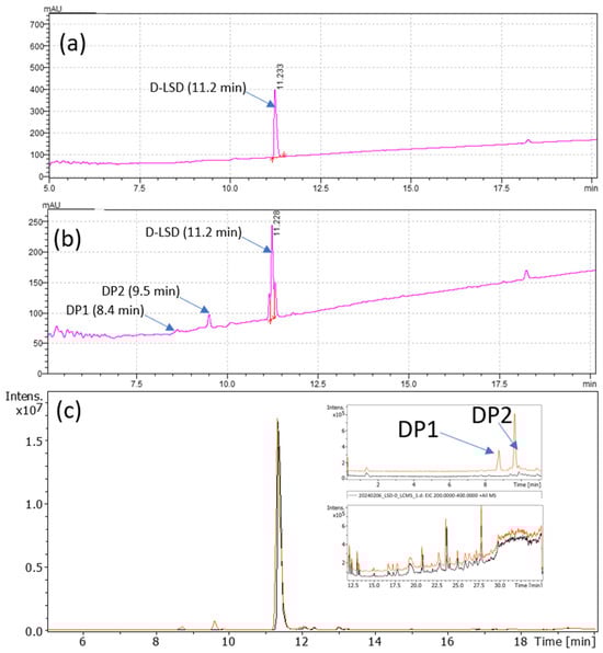 LC-UV and LC-MS analysis of D-LSD solution before and after light exposure; (a) LC-UV chromatogram of freshly prepared D-LSD solution, showing the main peak at 11.2 min under baseline conditions; (b) LC-UV chromatogram of the same solution after 30 s of ICH Q1B-compliant photostress exposure, revealing the appearance of two new peaks at 8.4 and 9.5 min; (c) overlay of total ion chromatograms (TIC) before (black) and after (orange) light exposure, highlighting the formation of degradation products in the exposed sample.