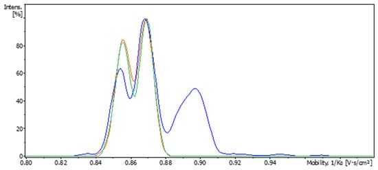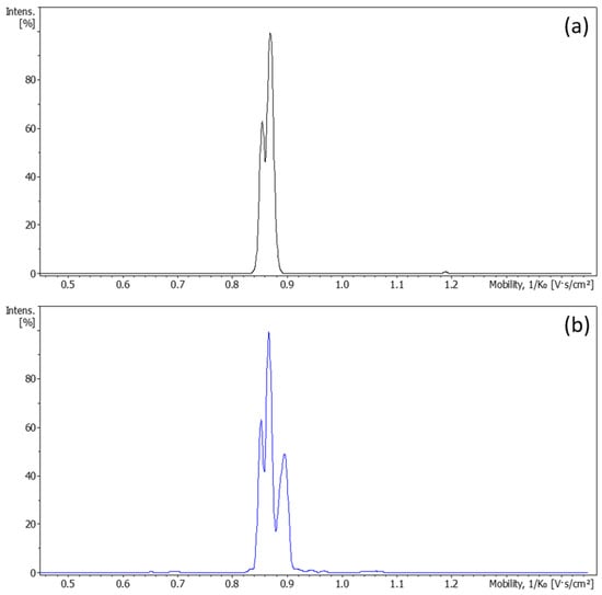 As shown in Figure 5a,b, the LC-UV chromatograms of the fill formulation before and after light exposure were visually identical. The main peak corresponding to D-LSD remained at 11.2–11.4 min, and no additional peaks appeared at retention times of 8.4 min or 9.5 min, where DP1 and DP2 eluted in the degraded solution. In Figure 6, the overlaid mobilograms recorded at the retention time of the main D-LSD peak (RT 11 min) show the absence of formation of a compound of mobility 0.90 (V.s/cm2) in the formulation exposed to light, confirming that the liquid vehicle provides effective intrinsic protection against photodegradation.