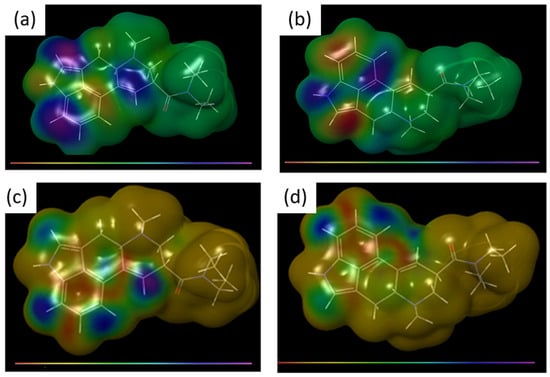 Spin density and HOMO mapping of the D-LSD radical cation (D-LSD•+); (a,b) calculated HOMO electron density map of D-LSD•+ showing localization on the indole nitrogen and C8=C9 double bond, suggesting likely sites for oxidation; (c,d) spin density map of D-LSD•+, highlighting reactive regions with potential to initiate photochemical transformation. Regions with the lowest and highest values are mapped in red and purple, respectively (see color scale). These calculations support the mechanistic plausibility of oxidative degradation pathways leading to DP2.