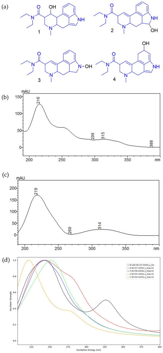 TD-DFT-predicted and experimental UV spectra for candidate DP2 structures; (a) structures of four plausible oxidative degradation products derived from D-LSD spin density localization; (b) experimental LC-DAD UV spectrum of DP2 eluting at 9.5 min after light exposure; (c) UV spectrum of standard D-LSD; (d) TD-DFT-simulated spectra for the candidate structures shown in (a). Only Compound 1 (brown trace) matches the experimental DP2 spectrum, especially the shoulder at ~275 nm. This supports assignment of DP2 to a specific oxidative rearrangement product.