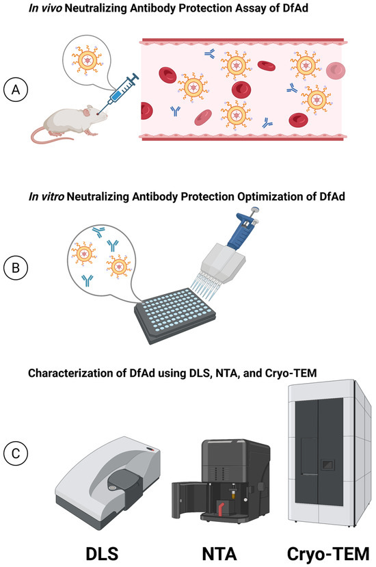 Experimental framework for the present study. The present study is organized around three main experiments. (A) The in vivo neutralizing antibody protection assay was performed on immunized mice to evaluate the in vivo neutralizing antibody protection capabilities of DfAd. (B) The in vitro neutralizing antibody protection assays were performed to optimize the DfAd formulation. (C) DfAd was characterized using dynamic light scattering (DLS), nanoparticle tracking analysis (NTA), and cryogenic transmission electron microscopy (cryo-TEM). Created in BioRender. Phung, A. (2025) https://BioRender.com/31uduc2. Accessed on 26 May 2025.