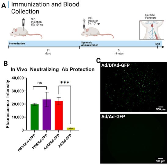 In vivo neutralizing antibody protection of DfA against pre-existing anti-Ad antibodies. (A) Schedule for mouse immunization, sample administration, and cardiac puncture. Immunocompetent Balb/c mice are immunized subcutaneously with 5 × 108 vp of Ad or an equal volume of PBS. Twenty-one days later, mice are RO-treated with 5 × 108 vp DfAd-GFP or Ad-GFP; 5 min later, mice are sacrificed, and blood is collected via cardiac puncture. (B) In vivo neutralizing antibody protection assay performed by transducing HEK293 cells with serum from PBS or Ad-immunized mice systemically treated with either Df-AdGFP or Ad-GFP. PBS/DfAd-GFP = transduction efficiency of serum extracted from mice immunized with PBS and systemically injected with DfAd-GFP (green). PBS/Ad-GFP = transduction efficiency of serum extracted from mice immunized with PBS and systemically injected with Ad-GFP (purple). Ad/DfAd-GFP = transduction efficiency of serum extracted from mice immunized with Ad and systemically injected with DfAd-GFP (red). Ad/Ad-GFP = transduction efficiency of serum extracted from mice immunized with Ad and systemically injected with Ad-GFP (gold). *** p < 0.001, n = 4. (C) Fluorescent micrographs of HEK293 cells transduced with serum from a mouse immunized with Ad and systemically injected with Df-AdGFP (top) and a mouse immunized with Ad and systemically injected with Ad-GFP (bottom). Both images were auto leveled using the preview application to improve contrast. Created in BioRender. Phung, A. (2025) https://BioRender.com/4eh0ucc. Accessed on 26 May 2025.