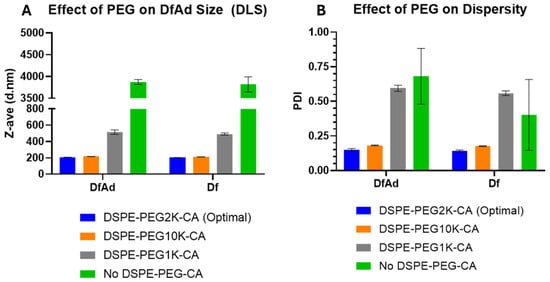 Characterization of various DfAd formulations using DLS. (Table 1) The effect of PEG lipid composition and length on the particle size using DLS on DfAd. Fold change refers to the relative change in z-average diameter or PDI of the DfAd sample of interest compared with the z-average diameter or PDI of DfAd with DSPE-PEG2000-CA. (A) Graphical representation of the effect of PEG on DfAd size. (B) Graphical representation of the effect of PEG on particle dispersity (uniformity).